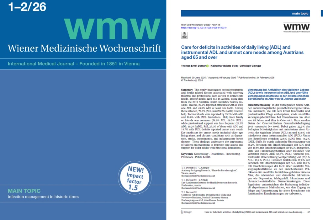 Zusammengefasst hat etwa jede*r Fünfte über 65-Jährige in Österreich Schwierigkeiten mit Aktivitäten des täglichen Lebens oder mit instrumentellen Tätigkeiten. „Diese Ergebnisse unterstreichen die Bedeutung individuell abgestimmter Maßnahmen, um den Zugang zu Pflege und Unterstützung für ältere Erwachsene mit funktionellen Einschränkungen zu verbessern“, so die Autor:innen Thomas Dorner, Viktoria Stein und Christoph Gisinger.